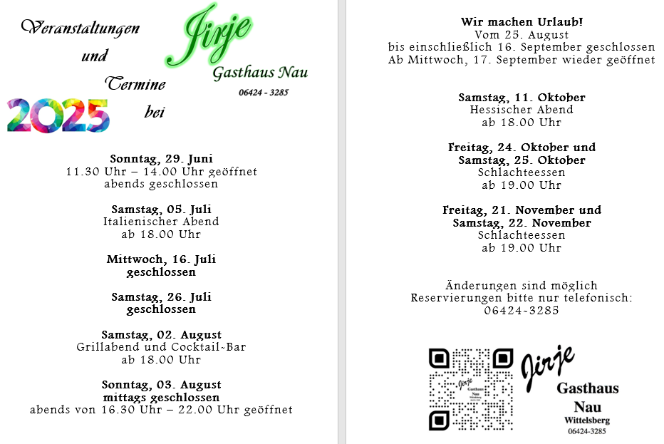 Für Fragen und Reservierungen stehen wir gerne zur Verfügung: 06424-3285
